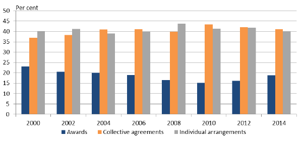 357 21.4 per cent of females and 16.1 per cent of males were award reliant as at May 2014: ABS, Employee Earnings and Hours, Australia, May 2014, Catalogue No. 6306.0.