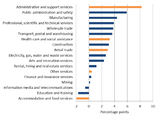 332 The difference between the 2.7 percentage point rise and the sum of the falls in employees paid under an individual arrangement or collective agreement (2.1 and 0.9 percentage points respectively) is accounted for by an increase in the residual category (owner managers of incorporated enterprises) and rounding.