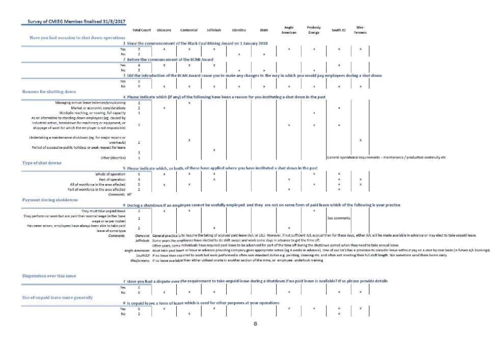 ‘(iii) if the employee has not accrued an entitlement to any paid annual leave sufficient to cover any part of the temporary shutdown period, then the employee is taken to be on leave without pay for the relevant period.’ [19] In support of its proposed shutdown clause the CMIEG relies on the results of a survey conducted of company groups that participate in the CMIEG. Details of the survey and the results are set out in the statement of David Gunzburg. 9 The survey asks a range of questions in respect of annual leave shutdown. Some nine company groups responded to the survey. The survey respondents are major operators in the black coal mining industry in NSW and Queensland, which collectively operate 55 mines employing approximately 28,000 workers. [20] The CMIEG submits that the results of the survey demonstrate the following: